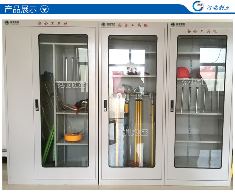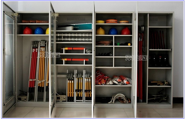 1、柜體是冷軋鋼板卷壓成型,厚度有1.0mm,1.2mm,1.5mm供選擇。柜體表面采用靜電防腐噴塑工藝,顏色為駝灰色,柜門裝有通體透明鋼化玻璃,透過玻璃可以看到分類有序的工器具。