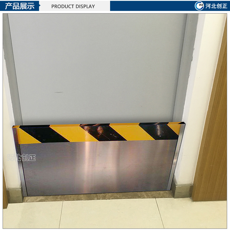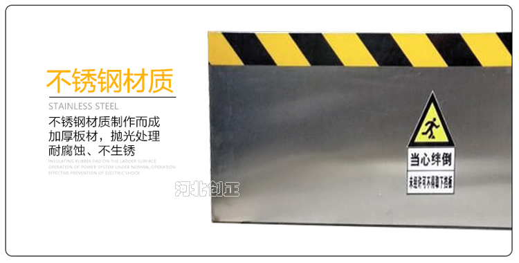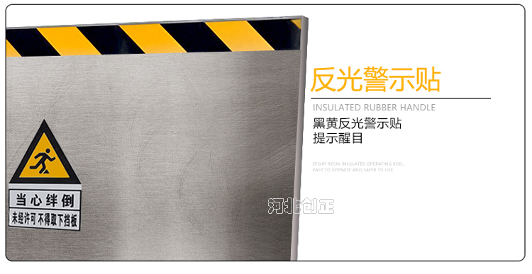 不銹鋼擋鼠板表面經(jīng)防腐處理。擋板上部貼有黃黑相間的反光條,起到警示作用。