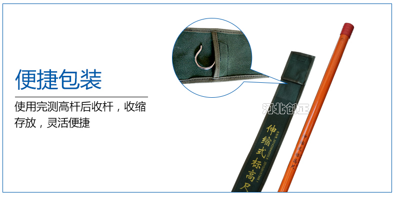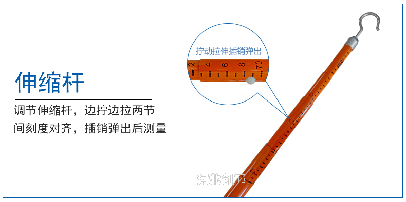 4、測量時,由內(nèi)層絕緣桿向上抽起,每根絕緣桿的刻度對應(yīng)外面一層絕緣桿的尺寸刻度,然后旋緊絕緣桿,測高桿的金屬掛鉤掛在高壓線路上,此時外側(cè)的絕緣桿上沿對齊抽起的絕緣桿的刻度;